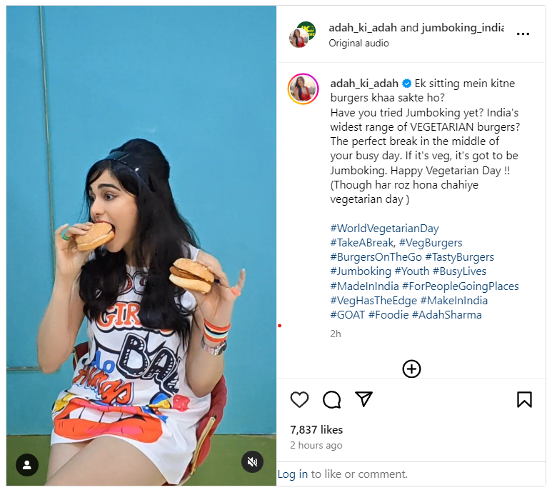 Popular actor Adah Sharma is known to be a staunch vegetarian. Little wonder then that she endorsed Jumboking, India’s widest range of vegetarian burgers, taking to social media to express her solidarity with vegetarianism.