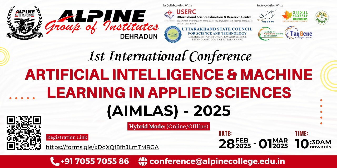 Dehradun, Uttarakhand – February 2025 : Alpine Group of Institutes, Dehradun, has announced the launch of its 1st International Conference on Artificial Intelligence and Machine Learning in Applied Sciences (AIMLAS-2025). Scheduled to take place from February 28 to March 1, 2025, at the Alpine Institute’s Main Campus in Prem Nagar, Dehradun, this event aims to bring together global experts in AI and ML.