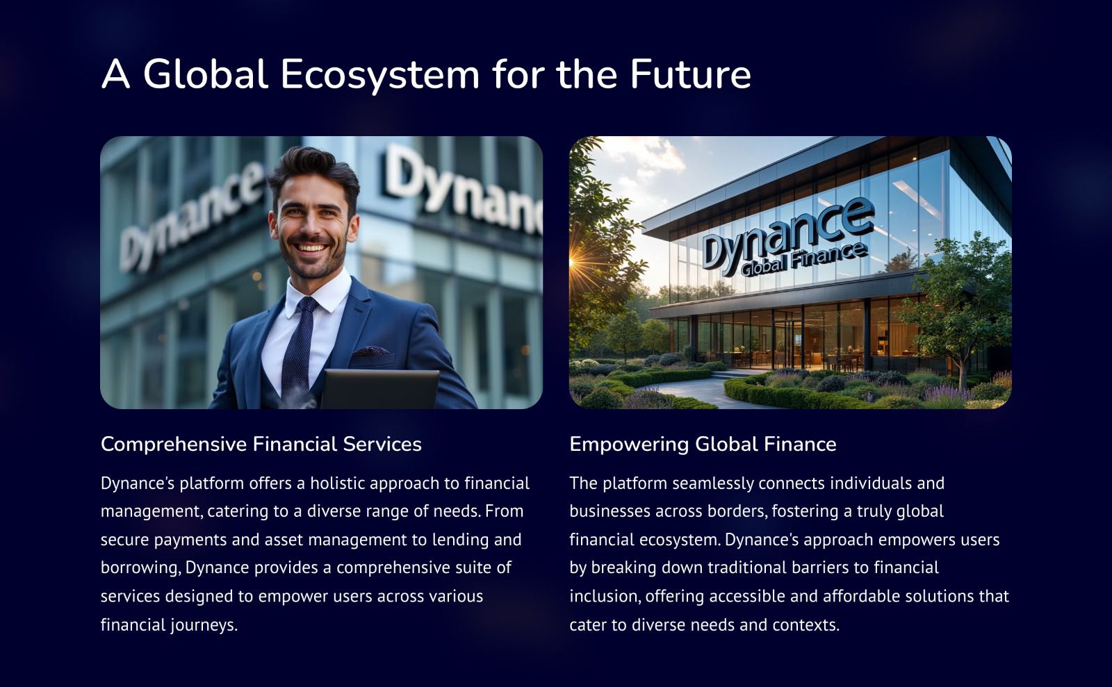 As Dynance continues to expand and evolve, the focus remains on delivering sustainable financial solutions that empower individuals and communities worldwide. With a solid foundation and a forward-thinking approach, Dynance is well-positioned to lead the future of finance.