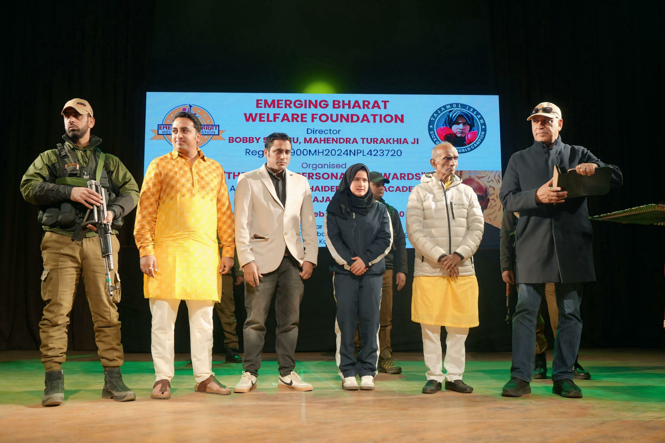 Srinagar, J&K February 17, 2025 – The Emerging Bharat Welfare Foundation, under the leadership of directors Bobby Siddhu and Mahendra Turakhia Ji, successfully completed their third event, ‘The Sports Personality Awards,’ in collaboration with Tajamul Islam. This prestigious event aimed to recognize outstanding athletes, including world champions in kickboxing, para-athletes, and other exceptional sports personalities who have brought immense pride to the nation.