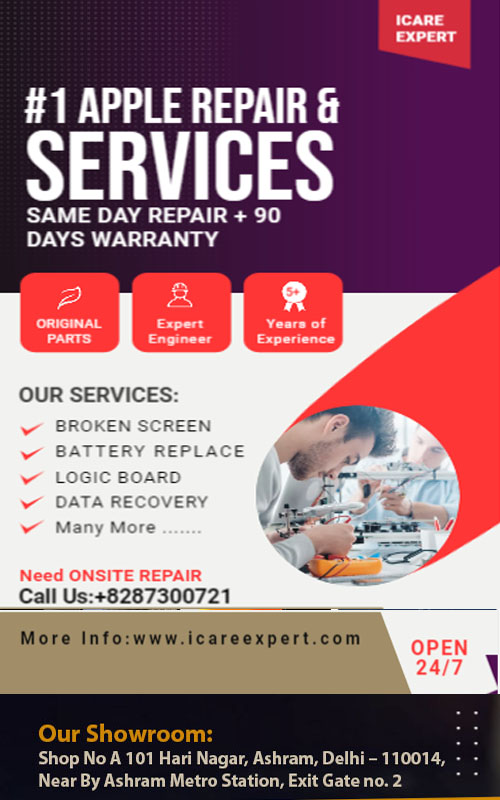 iCareexpert is a renowned Apple repair center in Delhi, specializing in MacBook repair in Delhi, iPhone repair in Delhi, and iPad repair in Delhi. The service center is committed to providing reliable, quick, and affordable solutions for all Apple device issues. With a team of certified professionals and a customer-first approach, iCareexpert has established itself as a trusted name in Apple device repairs.