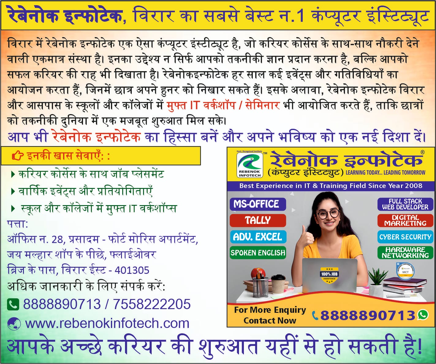 Rebenok Infotech, a leading name in IT training services since 2008, has become Virar’s No.1 computer institute. With top-quality education and advanced technology training, Rebenok Infotech is the preferred choice for students and professionals alike.