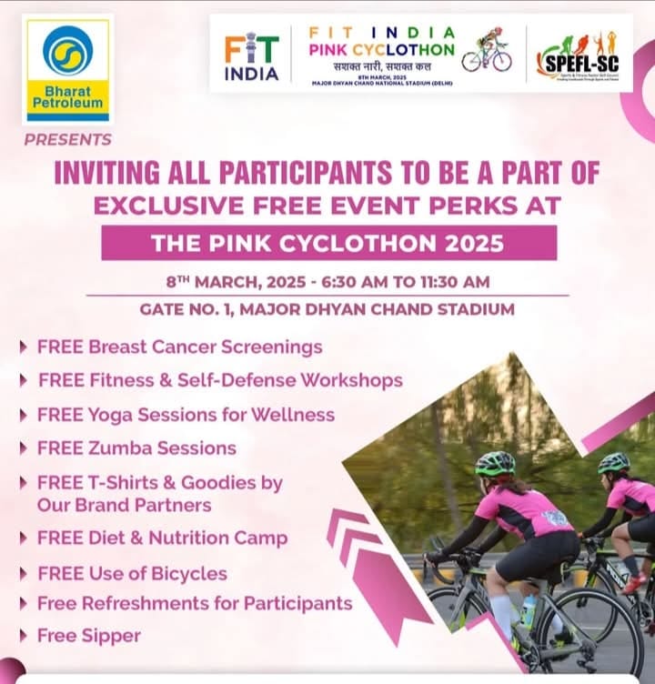The Sports, Physical Education, Fitness & Leisure Skills Council (SPEFL-SC) in collaboration with Bharat Petroleum and Fit India Mission is set to launch the “Fit India Pink Cyclothon Season 2– 2025.” Following the visionary path shown by our respected Prime Minister, this event holds the theme of “Sashakt Naari, Shashakt Kal,” to inspire every young woman to take charge of their health and future. This collaborative event is scheduled to take place on March 8, 2025, at the prestigious Major Dhyan Chand Stadium.