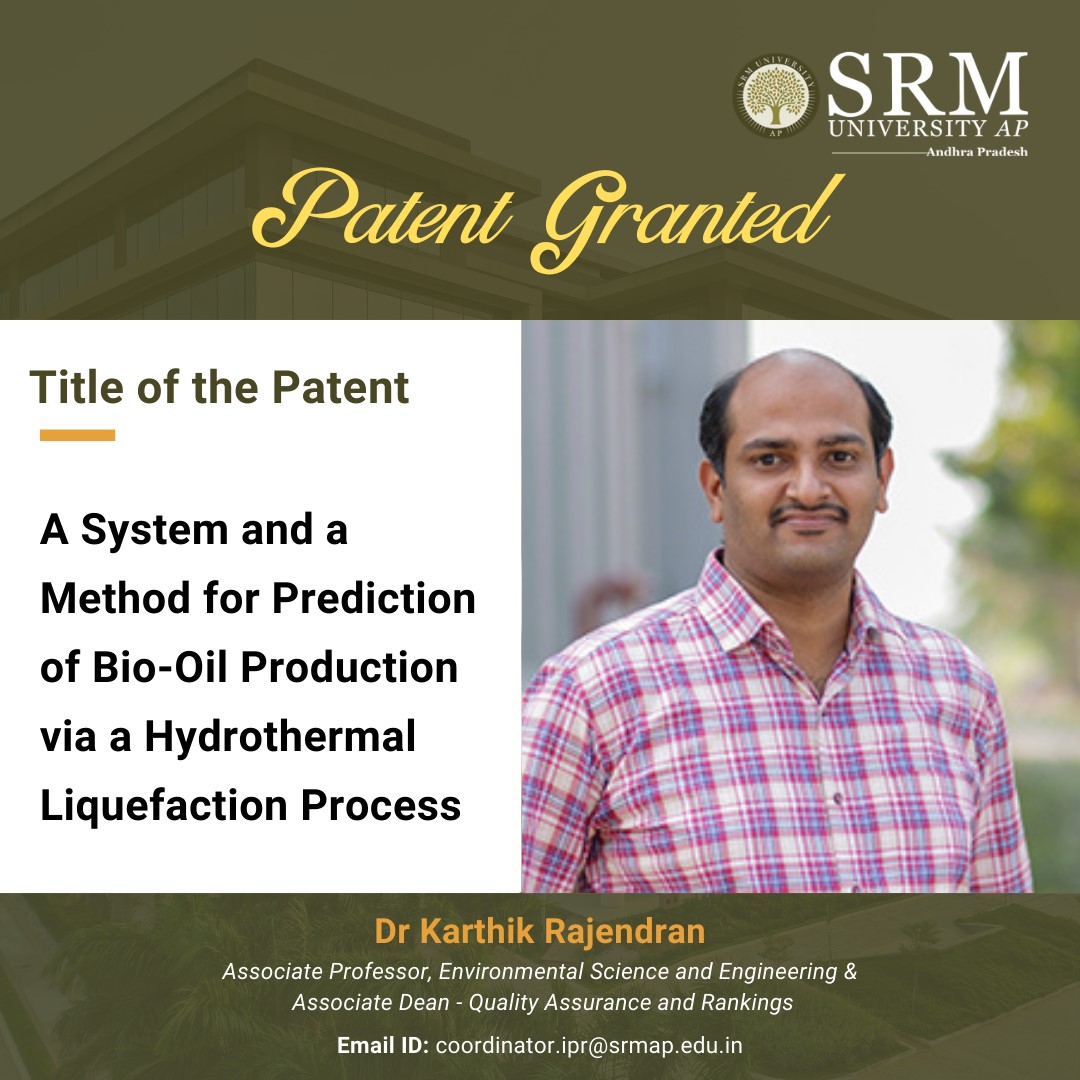 India, July 19, 2024: In a world grappling with the twin crises of climate change and dwindling fossil fuel reserves, SRM University-AP’s Net Zero Lab has made a landmark contribution to sustainable energy innovation. The lab’s newly patented system, encapsulated by Patent No. 537715, represents a monumental leap in bio-oil production—a renewable liquid fuel derived from biomass such as algae. This innovation not only promises a cleaner alternative to conventional fossil fuels but also enhances the efficiency and predictability of bio-oil production through cutting-edge machine-learning techniques.