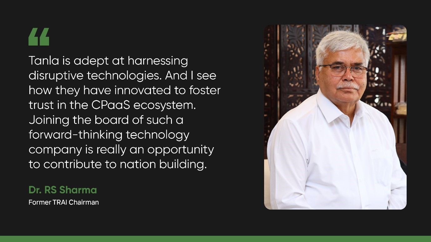 HYDERABAD, India — Jan 8, 2024 — Tanla Platforms Limited (NSE:TANLA, BSE:532790), India’s leading CPaaS player announced the appointment of former TRAI Chairman Dr. RS Sharma to its board of directors, bringing the total number of directors on Tanla’s Board to 7.