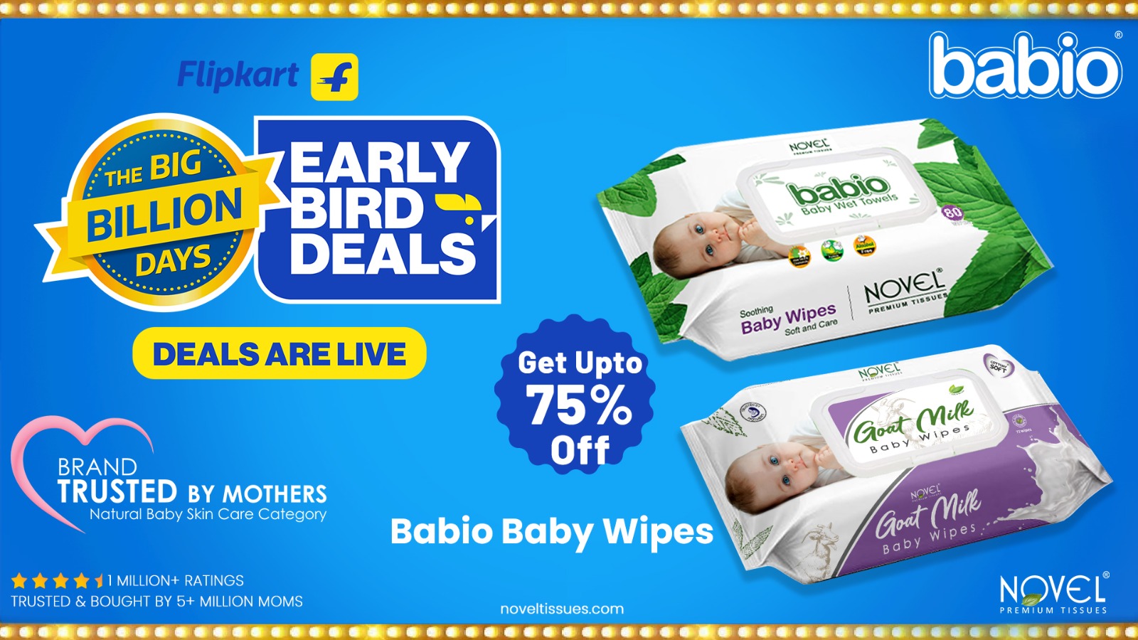 Mark your calendars—Big Billion Days starts 23rd September 2025. Your favorite brand, Novel Babio Baby Products, including Babio baby wipes, Goat milk baby wipes and more, is making that worry a thing of the past with up to 75% off on Flipkart. Parents across the country can now choose wipes enriched with aloe vera and chamomile, trusted for their soothing and natural care, with cost-effectiveness.